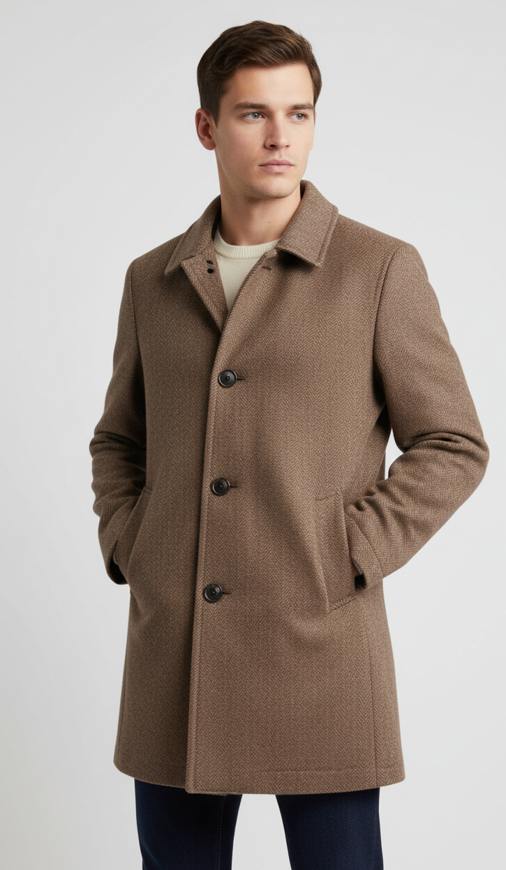 Develop a refined, versatile men’s coat that delivers exceptional warmth and classic style without compromising on comfort or modern functionality. The goal was to create a piece suitable for diverse cold-weather environments—one that combines the sartorial elegance of traditional tailoring with practical features designed for everyday wear and robust protection against the elements, all while maintaining a luxurious feel.